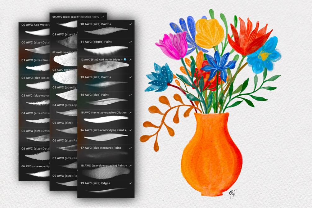 - 40+ authentic watercolor brushes made with Procreate’s “Brush Studio” (dual brushes, color dynamics etc.)